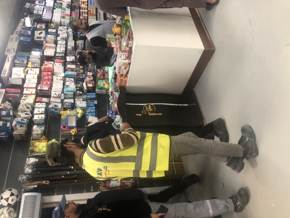 The image depicts an interior scene within a retail establishment located in النعيلة, Saudi Arabia. The store features a light grey floor and dark-colored walls lined with shelves. These shelves display a variety of packaged electronic accessories, including headphones, cables, and small devices, alongside belts and several tennis balls in a mesh bag. On the right, a white L-shaped sales counter with a dark brown kick plate holds assorted snack foods, candies, and a gold-colored Dallah (Arabic coffee pot). A dark wooden decorative stand with a gold emblem is positioned adjacent to the counter. A red fire extinguisher is mounted on the left wall. Five adult males are observed. In the immediate foreground, a man is seen from the back, wearing a bright yellow high-visibility vest over a brown and striped long-sleeve shirt, grey trousers, and dark work boots. He wears a dark green cap and holds a clear plastic bag in his left hand. To his left, partially visible, another man wears a blue baseball cap, a dark jacket, and light grey trousers, holding a dark smartphone. Behind the sales counter, two men are engaged: one in a dark shirt looking downwards at the counter, and another in a grey vest over a dark shirt, similarly focused on items on the counter. The lower extremities of a fifth man, dressed in brown attire and dark sandals, are visible on the far right. The overall scene indicates commercial activity within a retail environment.