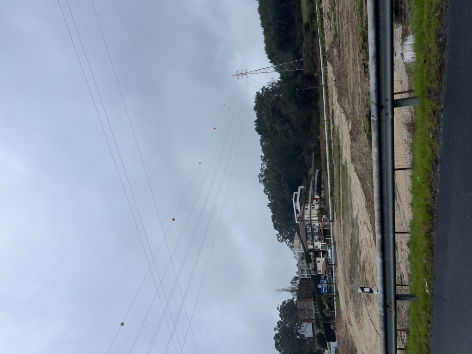 The scene depicts an overcast daytime landscape in Penafiel, Portugal, characterized by a mix of infrastructure, developed areas, and natural elements. In the immediate foreground, a dark asphalt road runs horizontally, bordered by a metal guardrail to the right. Beyond the guardrail, a strip of green grass gives way to a large, unpaved area of disturbed earth, exhibiting varying shades of brown and evidence of recent earthmoving, with a small puddle visible on the far right. A white and black roadside marker post is positioned behind the guardrail on the left. The midground features a collection of buildings situated on a gentle incline, interspersed with dense green trees. A prominent multi-story building, possibly a commercial establishment like a hotel or restaurant, with a light-colored facade and a terracotta roof, is centrally located, with several white vehicles parked in front. A blue sign, partially visible, reads "CLUB" and possibly "PENAPARK." To the left of this building, another structure appears to be under construction or renovation, with exposed materials. Further left, additional modern residential-style buildings are partially obscured by foliage. The background is dominated by a lush, dark green wooded hillside extending across the frame, particularly dense on the right. A tall, red and white lattice transmission tower (pylon) rises on the right side of the image, supporting overhead power lines. These numerous parallel power lines traverse the entire upper portion of the frame under a uniformly grey, overcast sky. Several spherical aviation marker balls are attached to these lines, appearing in alternating white and red colors. No individuals or overt interactions are discernible within the frame.