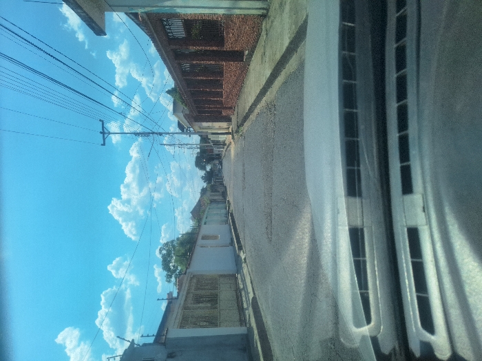 The image depicts a straight, residential street in Tinaco, Venezuela, viewed from the interior of a stationary vehicle. The vehicle's dashboard and windshield reflection occupy the lower portion of the frame. The paved asphalt road appears worn, extending into the distance under a bright blue sky with scattered white cumulus clouds. On the left side of the street, a row of single-story buildings with light-colored (white or grey) facades are visible, many featuring security bars or fences on windows and entrances. On the right side, the immediate foreground shows a single-story building constructed with reddish-brown brick, also equipped with dark security grates. A concrete sidewalk runs along this side. Multiple utility poles with a dense network of overhead electrical wires and cables line both sides of the street, predominantly on the right. Sparse green foliage is visible further down the street and between some structures. No individuals or other vehicles are present on the street or sidewalks, indicating a vacant scene. The environment is consistent with a quiet urban or suburban residential area under clear, daylight conditions.