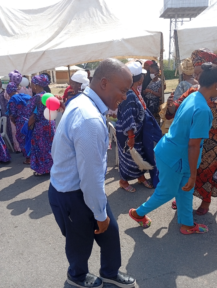 A group of people stands outdoors on pavement under a white tent. A man in a light blue shirt and dark pants stands to the left, with his head turned and smiling. A woman wearing a turquoise uniform stands to the right, while many women wear patterned dresses and head coverings. Some individuals wear masks. The background shows a water tower and more tents. The lighting is bright, and shadows stretch across the pavement.