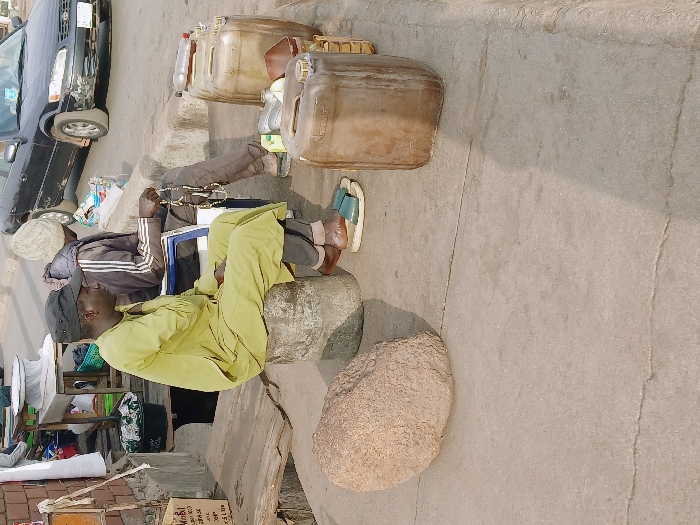 Two men sit on the side of a road. One is wearing a yellow outfit and a black hat and is resting his legs on a rock. The other is wearing a darker outfit and a white cap. They sit behind a stack of containers on a low curb. A black car is parked next to them. A small stand with goods sits to the side of the man in yellow.