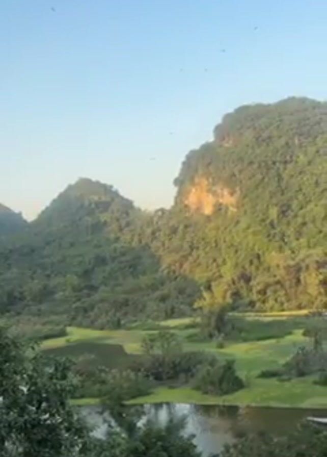 landscape featuring water, vegetation, and hills. The water is partially covered in green vegetation. Two rounded hills rise in the background, also covered in dense green vegetation. The sky is blue and clear. Several small birds are seen flying in the sky. Near the bottom of the frame, some tree branches provide a foreground element. A small boat with multiple people in orange life vests can be seen moving on the water in the distance.