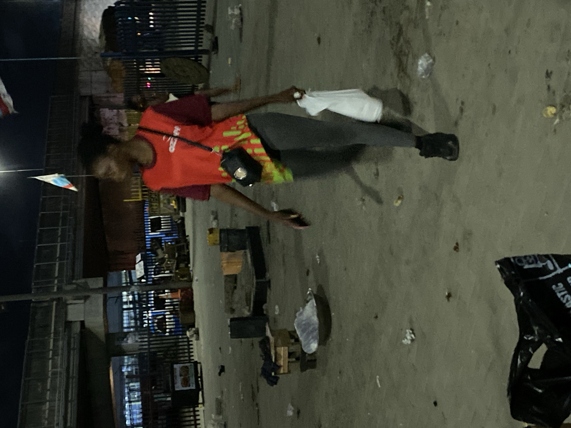 person walking on a littered street in Lekki, Nigeria, at night. The individual is wearing a red shirt, grey pants, and black shoes and carrying a white bag. Street food vendors and other businesses are visible along the side of the road. The scene appears to be a public space with moderate lighting.