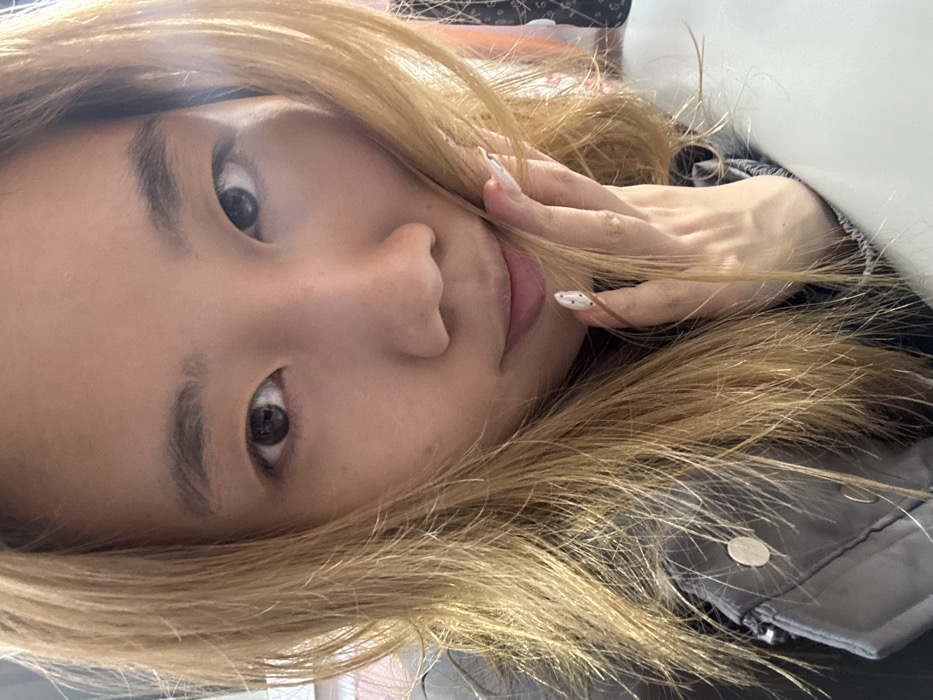 A headshot-style image captures an East Asian individual, appearing female, positioned centrally and looking directly into the camera. The subject exhibits light brown hair, which is long and frames her face. Her eyes are dark, and a subtle, closed-mouth expression is visible. The individual's right hand is raised, with fingers resting against her lower face and hair. Her visible fingernails are manicured, featuring a light base color adorned with small black dots. A dark grey or black garment, possibly a jacket, is worn, with circular silver-toned buttons visible on the left side of the frame. The background is shallowly focused, indicating an indoor environment with indistinct light-colored and darker areas. The scene is located in Shapingba District, China.