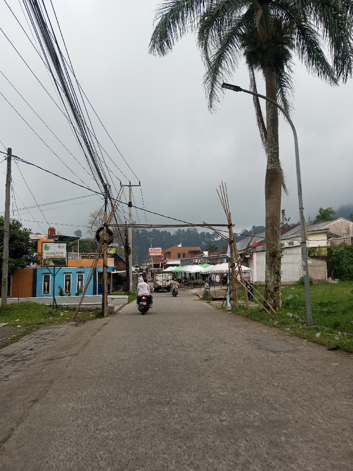 The image displays an outdoor street scene in the city of Sandamal Eliya, Sri Lanka, under an overcast sky. A paved road, appearing slightly worn, extends into the background. On the left, utility poles support a dense tangle of overhead electrical and communication wires. Below the wires, a two-story building features a light blue lower facade and an orange upper section, bearing a sign that reads "WISATA PETIK" and "STRAWBERRY". Further down the road on the left, another building displays a red sign, partially visible, that may read "Pristin." Mid-ground, a person wearing a light-colored garment is seen riding a black scooter away from the viewer. A smaller, lighter-colored vehicle is visible further ahead on the road. An improvised archway constructed from multiple bamboo or wooden poles spans the width of the road near the scooter. On the right side of the road, a tall palm tree stands beside a streetlamp pole. Beyond the palm tree, a patch of green grass precedes several structures. These include buildings and multiple market stalls covered by white and green awnings, with several indistinct human figures present near these stalls. In the distant background, hills are visible beneath the cloudy sky.
