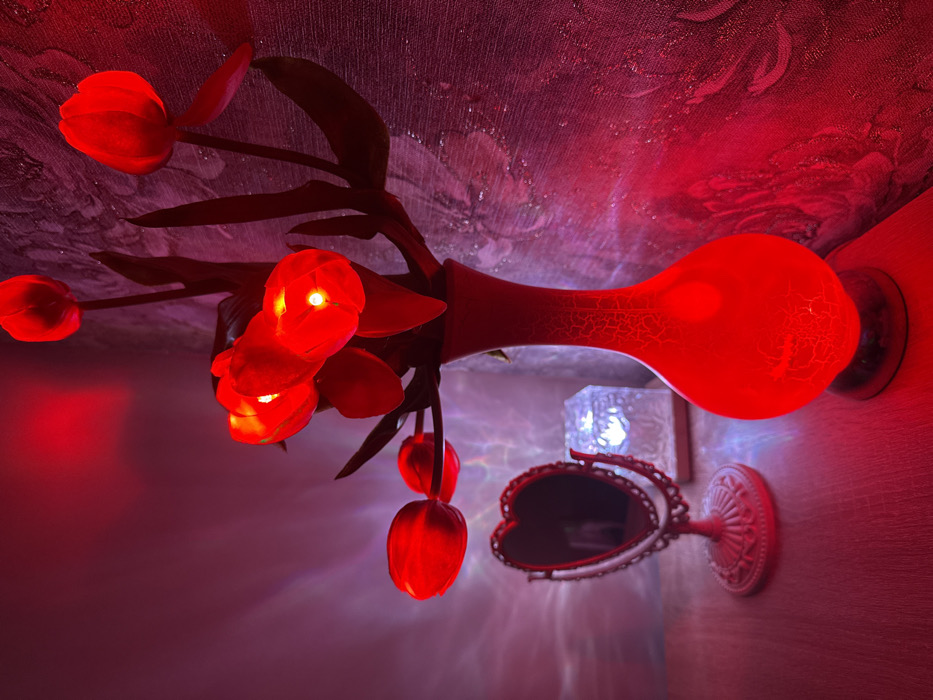 The image displays an indoor scene in Yablonovskiy, Russia, dominated by red ambient lighting. A tall, red-illuminated vase with a crackled texture on its upper half stands on a light-colored wooden surface. Inside the vase is an arrangement of approximately ten artificial tulip-shaped lights, each glowing red with visible internal light sources. To the left of the vase, a small, heart-shaped mirror with an ornate, possibly metallic, stand is positioned on the same surface. Behind the mirror, a rectangular object, possibly a decorative light, emits a softer white glow. The background wall features textured wallpaper with a subtle pattern visible under the red illumination. Reflected light patterns are present on the left wall and the wooden surface. No individuals are depicted.