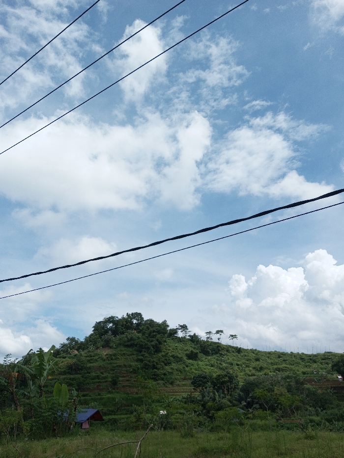 A landscape scene shows a grassy hillside covered in green vegetation, with terraced farming visible. A small structure is nestled among the trees. Overhead, black power lines crisscross the sky, which is filled with fluffy white clouds against a blue background. The composition is taken from a low angle, emphasizing the hill's height and the expansive sky.