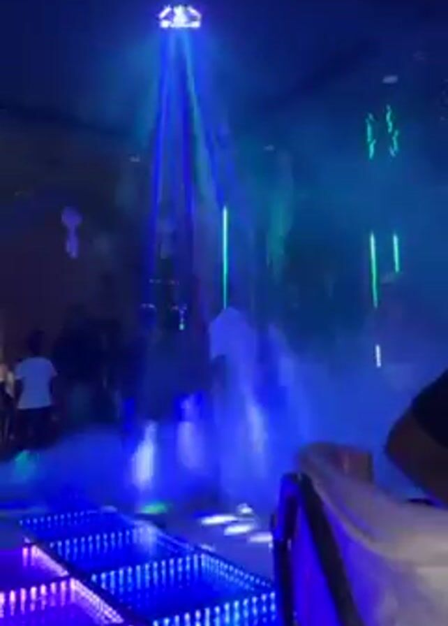 nightclub with people dancing on a lit-up dance floor, under colored lights and a fog machine