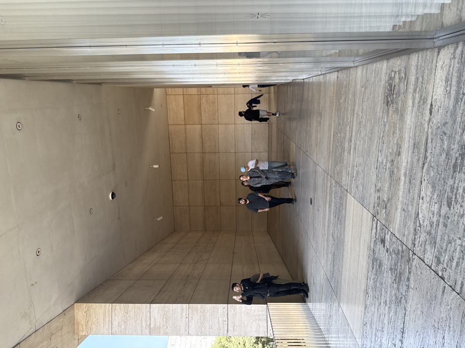 A group of people stands in a hallway with beige stone walls and floors. A man in black stands closest to the camera, while others are scattered further down the corridor. Some people are wearing casual attire, and one person has a face mask on. The corridor has a modern architectural design with geometric lines. Light fixtures are visible on the ceiling and walls. The scene is brightly lit, creating shadows on the stone surfaces.