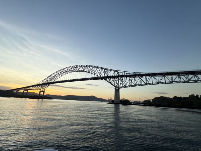 The image depicts the Bridge of the Americas (Puente de las Américas) spanning a wide body of water, identified as the Pacific entrance to the Panama Canal, situated near Ancón, Panama