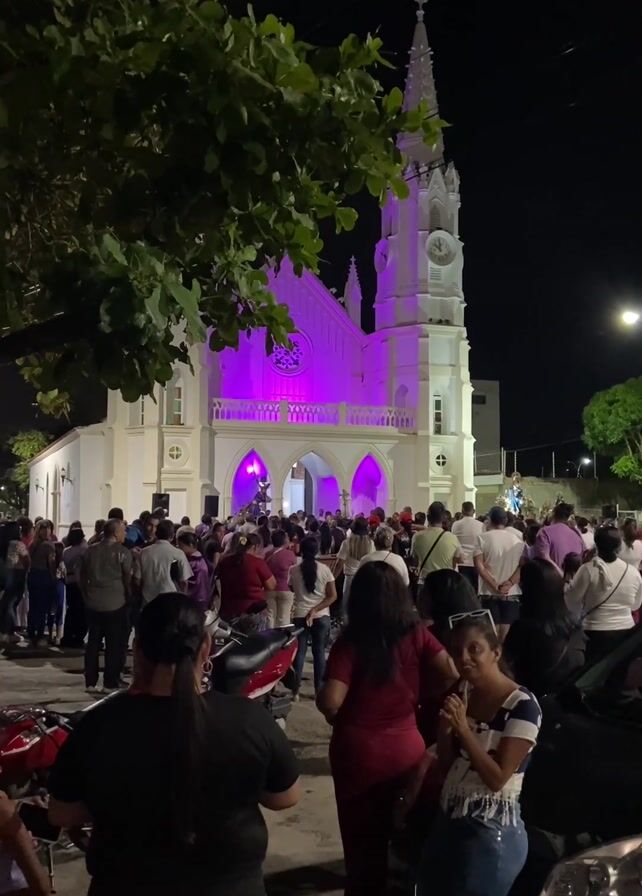 nighttime gathering of people outside a white church illuminated with purple lights