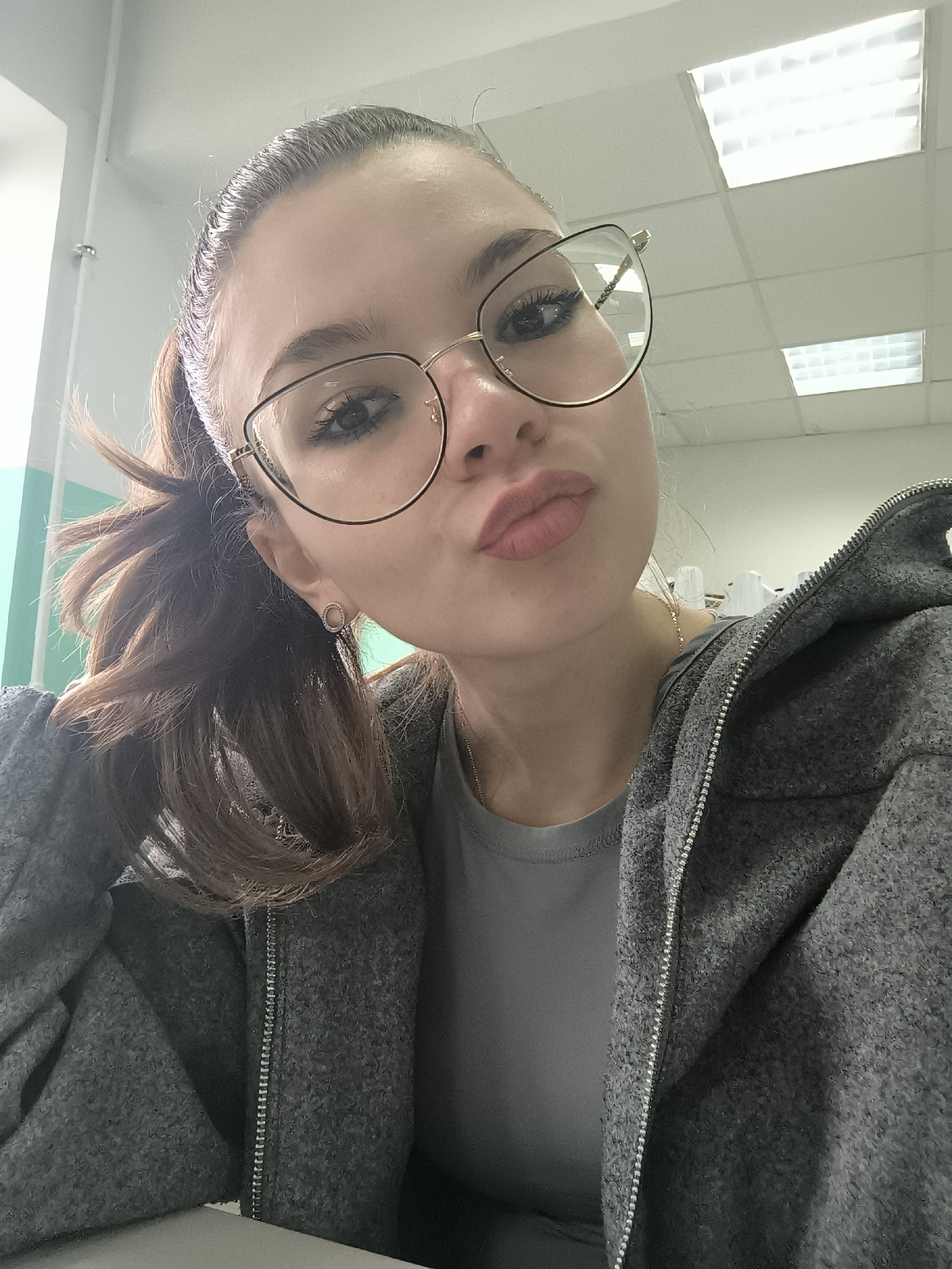 A young female subject is depicted in a close-up, selfie-style photograph taken indoors. She has brown hair pulled back into a ponytail, dark eyes enhanced with mascara and eyeliner, and a light complexion. She wears gold-framed eyeglasses with a black upper rim and a small, circular, open-hoop earring with embedded stones on her left earlobe. Her lips are pursed in a "kissing" pose, tinted with light pink lipstick. She is dressed in an open grey textured hoodie over a plain grey t-shirt, revealing a thin gold chain necklace. The background features a white ceiling with recessed rectangular fluorescent light fixtures and a light-colored wall with a vertical turquoise or mint green stripe on the left side. The specific location within the city of Pernik, Bulgaria, cannot be determined from the visual information present in the image.
