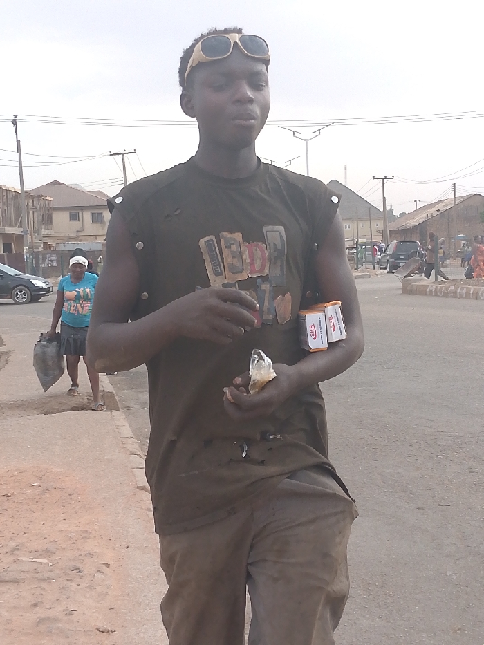 A young man stands on a street with two boxes of "SKB" products on his arm, holding a small plastic bag. He is wearing sunglasses atop his head, a sleeveless shirt with a graphic design, and pants that appear stained. A woman carries a black container on the sidewalk in the background, and other pedestrians walk near cars further down the street. Buildings and utility poles are visible in the distance under an overcast sky.