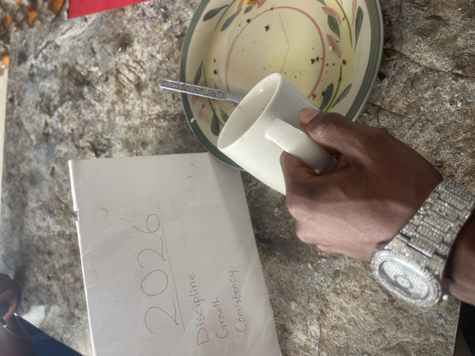 The scene is captured from a first-person perspective on a mottled brown and gray countertop surface in Alor, Nigeria. In the immediate foreground, a dark-skinned left hand wears a large, silver-toned wristwatch heavily encrusted with clear, reflective stones on its band and bezel. The hand holds a white ceramic mug by its handle, tilted slightly upwards. To the right of the mug, a round, light yellow plate with green and red leaf-like patterns on its rim contains dark food crumbs and streaks, suggesting a recent meal. A silver-colored spoon rests diagonally across the plate. In the mid-ground, a white rectangular board or sheet of paper stands upright, displaying "2026" written in red, capital-like numerals at the top. Below this, the words "Discipline," "Growth," and "Consistency" are written vertically in red text. A blurry dark shape is visible in the upper left background, possibly another person, and a hint of red and orange patterned fabric is discernible in the far right background.