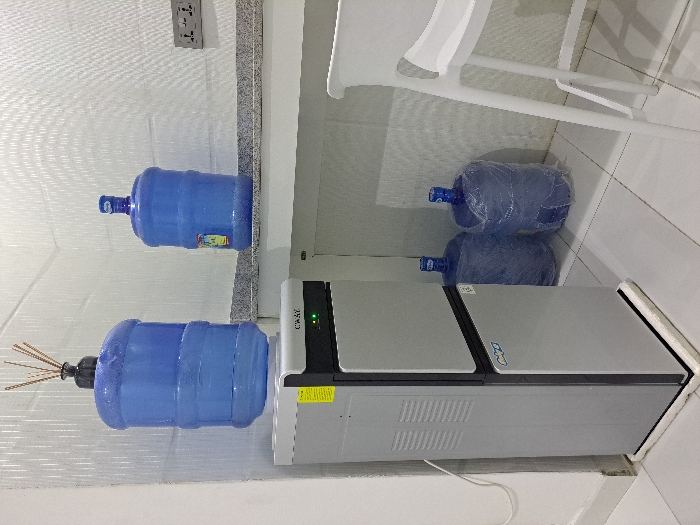 An indoor scene in an unknown location in Unknown, Unknown, displays a utility area for water dispensing and storage