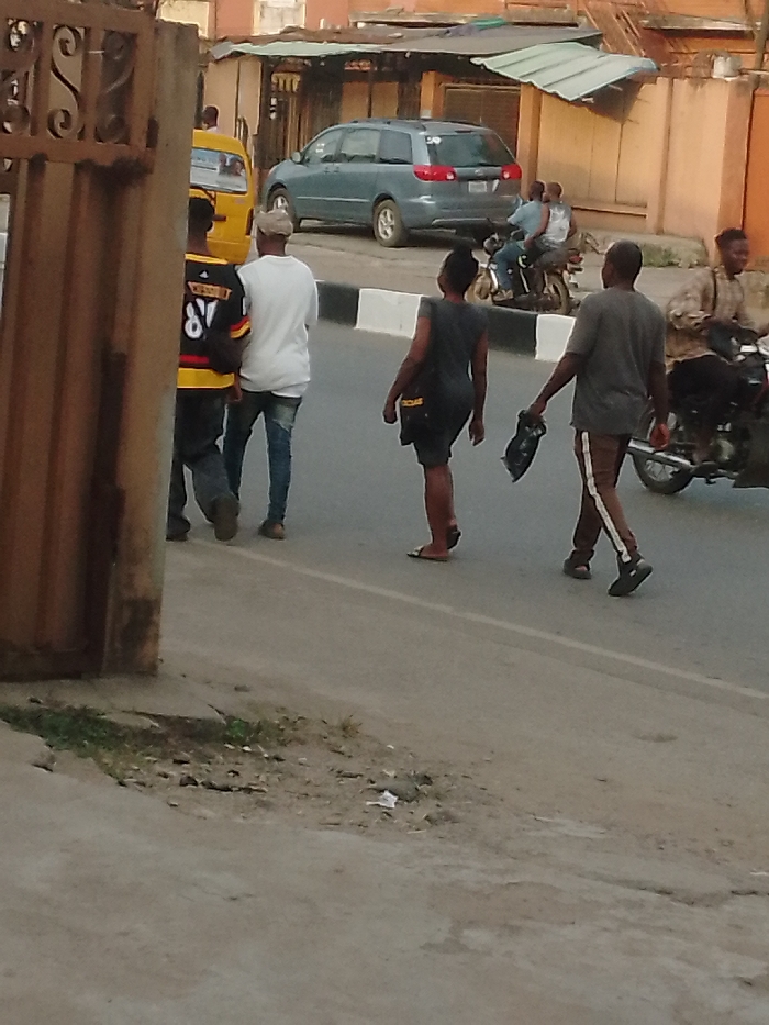 Four people are walking across a street. A woman in a gray dress walks in front of a man in a gray shirt and brown pants. Two men walk side by side to the left, one in a white shirt and one in a black and yellow jersey. A blue minivan and a yellow taxi are parked on the side of the street. Two people sit on a motorcycle and another person rides one. A metal gate is visible in the foreground.