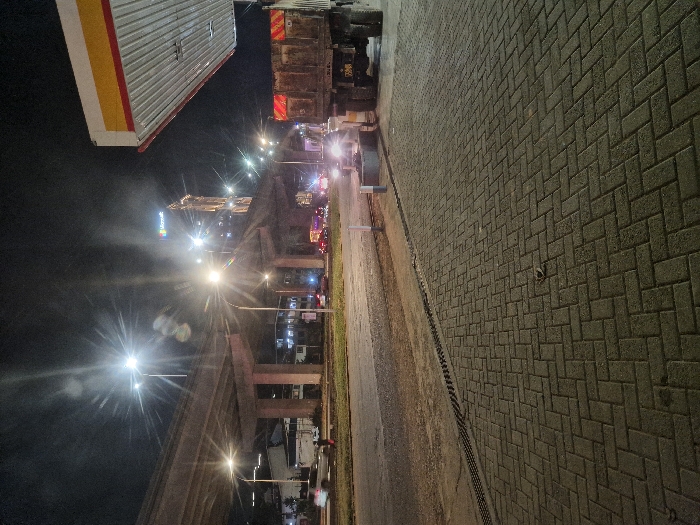 The image depicts a nighttime urban environment in Unknown, Unknown, observed from the paved forecourt of a Shell gas station. The foreground features grey interlocking concrete pavers laid in a herringbone pattern, with a dark drainage grate running along the edge. A dark, heavy-duty truck with an open-top cargo bed and rear red/yellow reflective markings is parked on the right, partially beneath a white and red/yellow Shell canopy. The midground contains a multi-lane asphalt road with ongoing vehicle traffic, visible as blurred white headlights and red taillights. Several streetlights illuminate the scene, creating distinct starburst patterns. A concrete elevated highway structure, supported by multiple pillars, spans across the upper midground. A single person is discernible walking on the far left, near the road or a median. Further down the road, flashing red and blue lights suggest the presence of emergency vehicles or an incident. In the background, beyond the elevated highway, a high-rise building is visible with an illuminated "Microsoft" logo near its summit, surrounded by other dimly lit structures. The sky is dark, indicating a nocturnal setting.