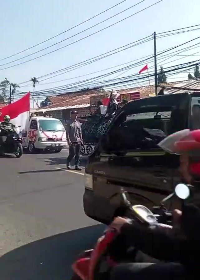 parade taking place on a street lined with buildings and power lines on a sunny day. A small white truck with a large Indonesian flag attached is followed by a black truck, and then a tank-like structure towed on a trailer. The tank is painted in a camouflage pattern with Indonesian flags. People are riding motorcycles and walking alongside the vehicles. Some are carrying Indonesian flags. The street is paved and has noticeable tire tracks.