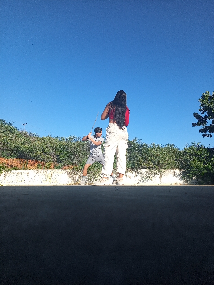 Two individuals stand on a paved surface under a clear blue sky. A woman with long, dark hair wears a red top and white pants, facing away from the viewer. A man holds a stick in a batting stance, wearing a gray t-shirt and shorts. They are situated near a low wall with green foliage in the background. The bottom of the image is shadowed.