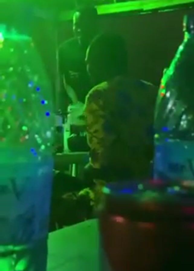 n indoor scene, likely a bar or lounge. The lighting is predominantly green, casting a vibrant hue on the environment. Several people are present, though their faces are partially obscured. One individual is wearing a colorful patterned shirt. The focus of the shot is on a table cluttered with various objects. These include plastic water bottles with blue caps, a partially visible red can, a glass, and a bottle of Gordon's gin. The scene suggests a social gathering with drinks and people interacting, though the details of their interactions are unclear due to the lighting and framing.