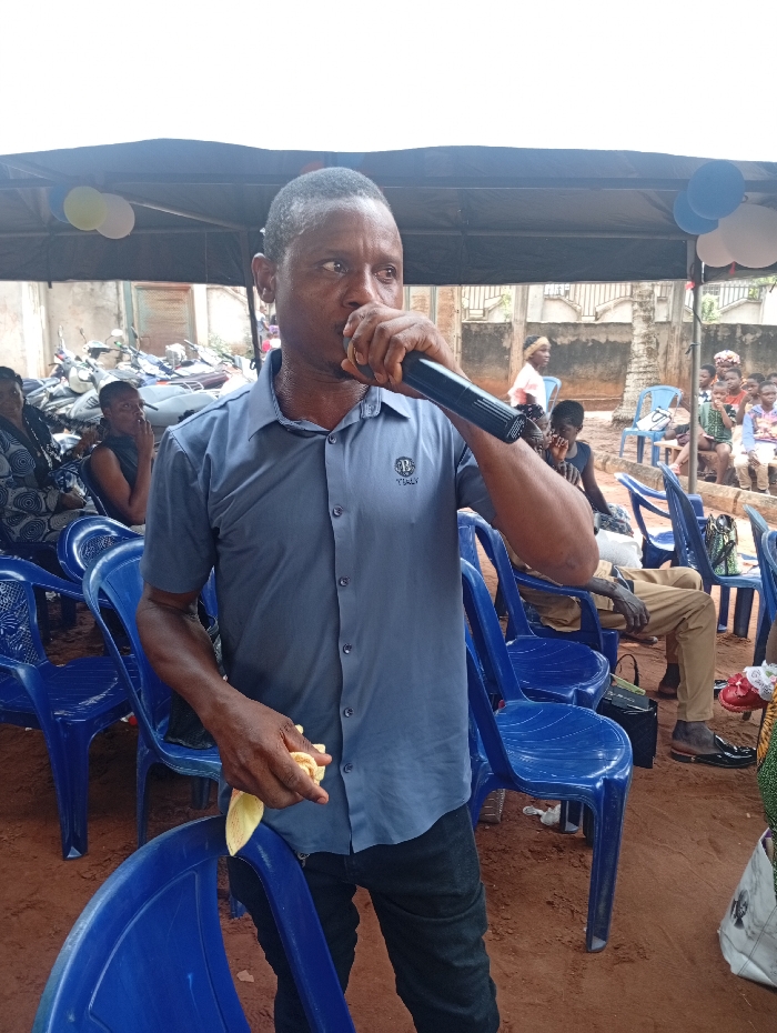 An outdoor gathering is depicted in the city of Agbor, Nigeria. A male individual of African descent, dressed in a light blue short-sleeved button-up shirt and dark trousers, stands centrally, speaking into a black wired microphone held in his right hand. His left hand holds a yellow object, possibly a banana or a folded cloth. He is positioned among numerous blue plastic chairs set on reddish-brown earth. In the background, under a black canopy tent, an audience of adults and children is seated on similar blue plastic chairs. On the far left, a line of motorcycles or scooters is visible behind seated individuals. On the right, more attendees, including children, are seated, and balloons in white, yellow, and blue are visible attached to the canopy structure. The background features light-colored building walls, a fence, and some sparse vegetation. The event appears to be a communal address or performance under a temporary shelter.