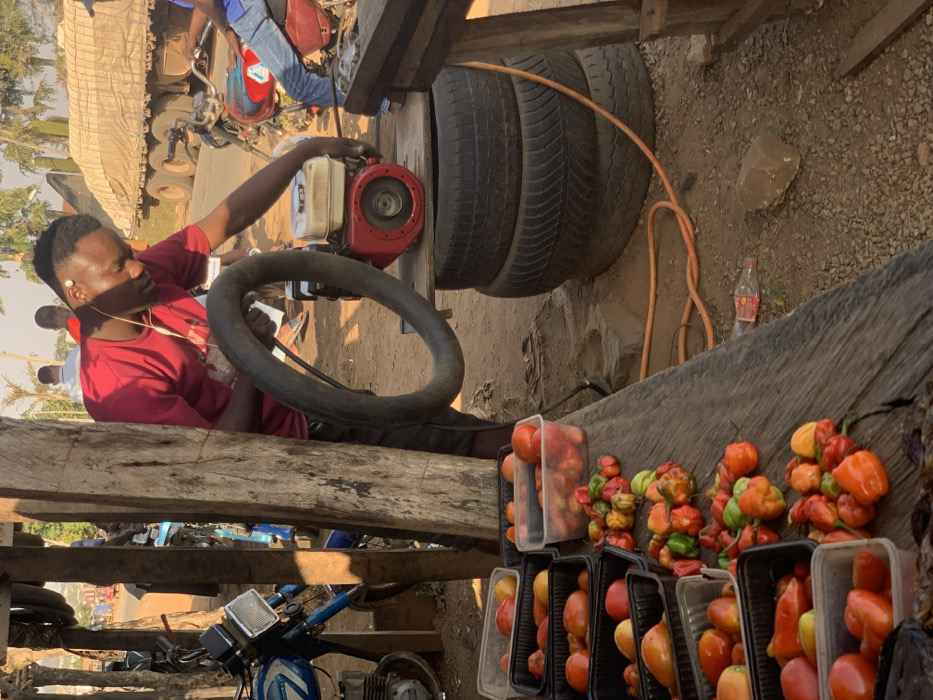 The image portrays an outdoor scene in Kabba, Nigeria, under natural daylight, centered on a roadside commercial activity. A young Black male, dressed in a red short-sleeved shirt, dark shorts, and white in-ear headphones, is positioned in the mid-ground. He is bent over, attending to a small red and white single-cylinder engine equipped with a clear fuel tank. His right hand is near the top of the engine, while his left hand holds a black hose connected to the apparatus. The engine is supported by a wooden plank resting on a stack of three dark vehicle tires. An orange cable or hose is coiled on the dusty, reddish-brown ground adjacent to the tire stack. In the foreground, a rustic wooden table displays agricultural produce. Multiple clear plastic containers hold red and orange tomatoes, while a separate pile of mixed colored peppers (orange, red, green, and yellow) lies directly on the table surface. A thick, rough-hewn wooden post, part of a market stall structure, is prominent in the mid-left foreground. The background reveals a street scene with various vehicles and individuals. A blue motorcycle with a chrome headlight is parked on the left. To the right, another person is partially visible, seated on a red motorcycle. Further in the distance, a large, tan-covered truck travels on a paved road, accompanied by other indistinct vehicles and human figures. A discarded plastic bottle and a light-colored rock are visible on the ground in the right foreground.