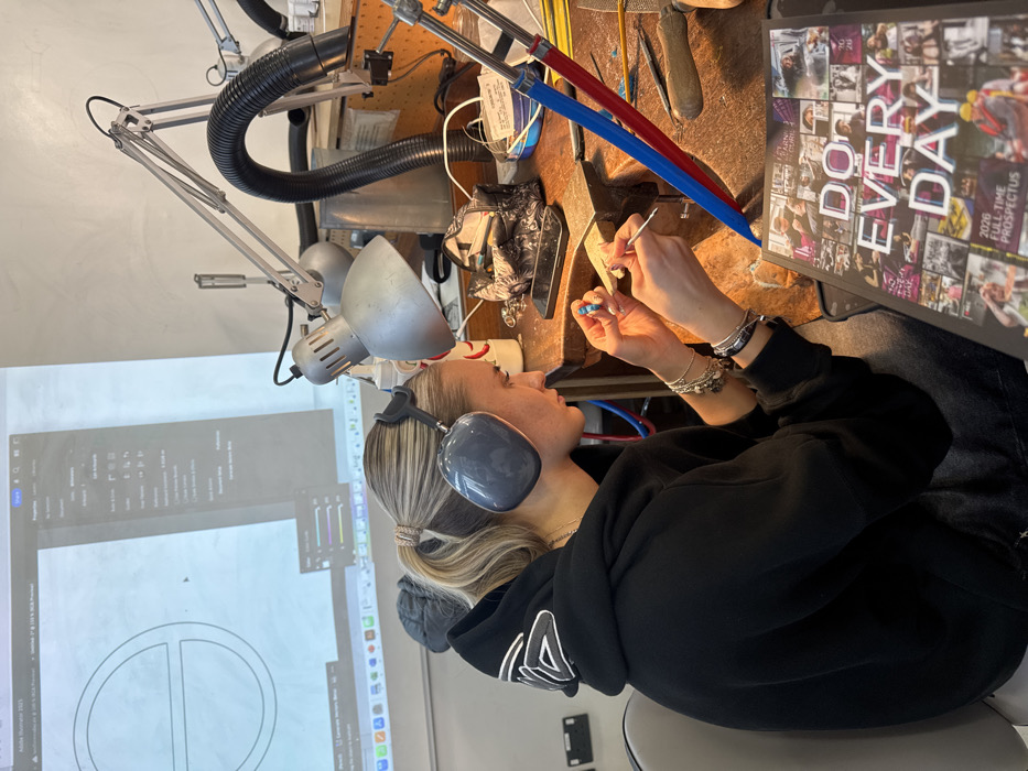 A young blonde female, with hair tied in a ponytail and wearing grey ear protection, is seated at a wooden jeweler's workbench