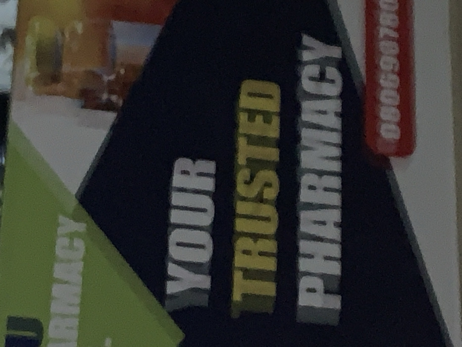 The image displays "YOUR TRUSTED PHARMACY" vertically stacked with each word on a separate line