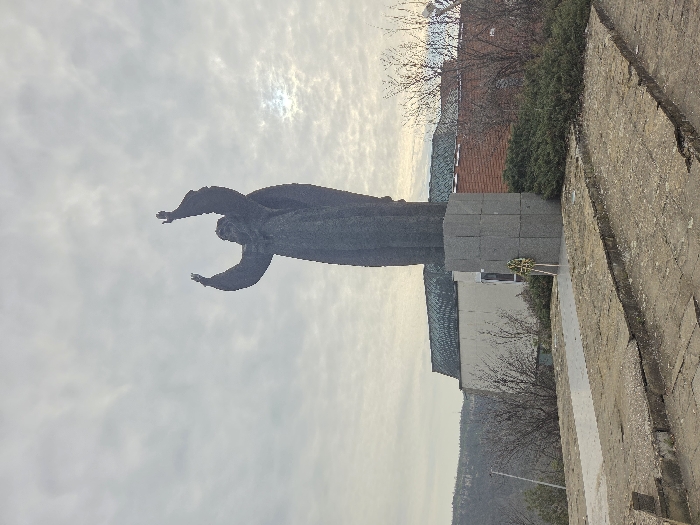 The image depicts the Monument to Bishop Ilarion Makariopolski in Veliko Tarnovo, Bulgaria