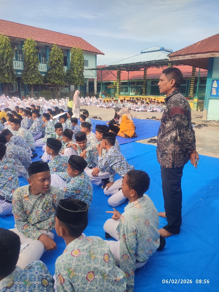A large group of young boys, mostly wearing floral shirts and black caps, sit cross-legged on a blue tarp outdoors, likely for an event. A man stands to the right, facing away from the camera, in a patterned shirt and dark pants. Behind the boys, other students are seated in rows, with buildings and trees forming the backdrop. The date 06/02/2026 and time 08:56 are visible in the lower right corner of the image.