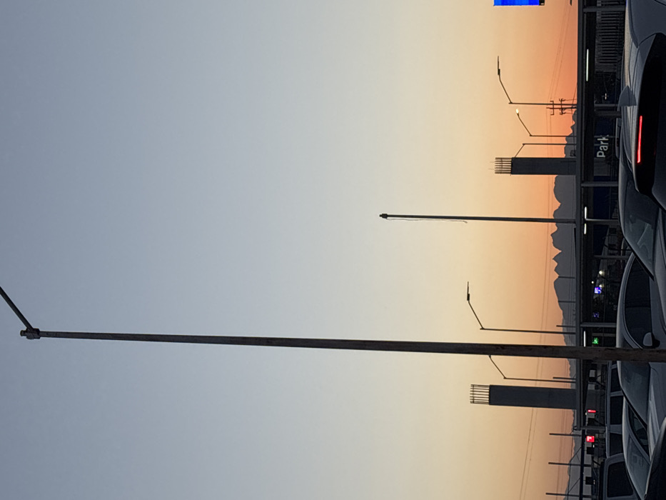 A parking lot at dusk with cars lined up. Tall metal poles extend toward the sky. There are light poles with curved arms. Mountains are visible in the distance, silhouetted against the sunset sky. The sky transitions from light orange near the horizon to a pale blue above. A "Park" sign is visible, partially obscured by vehicles. Construction structures rise up near the parking area.