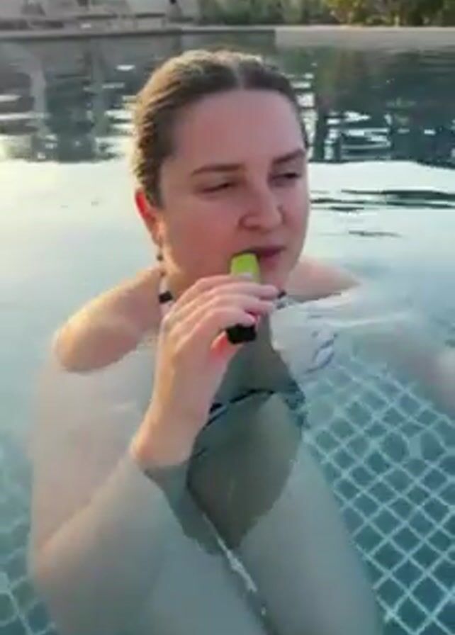 A woman with light skin, wearing a black-and-white striped swimsuit, is standing in a swimming pool with blue tiles. She is holding a black and lime green vape pen and inhales, then exhales a large puff of white smoke. The background shows lounge chairs with white umbrellas, a pink-flowering bush, and trees.