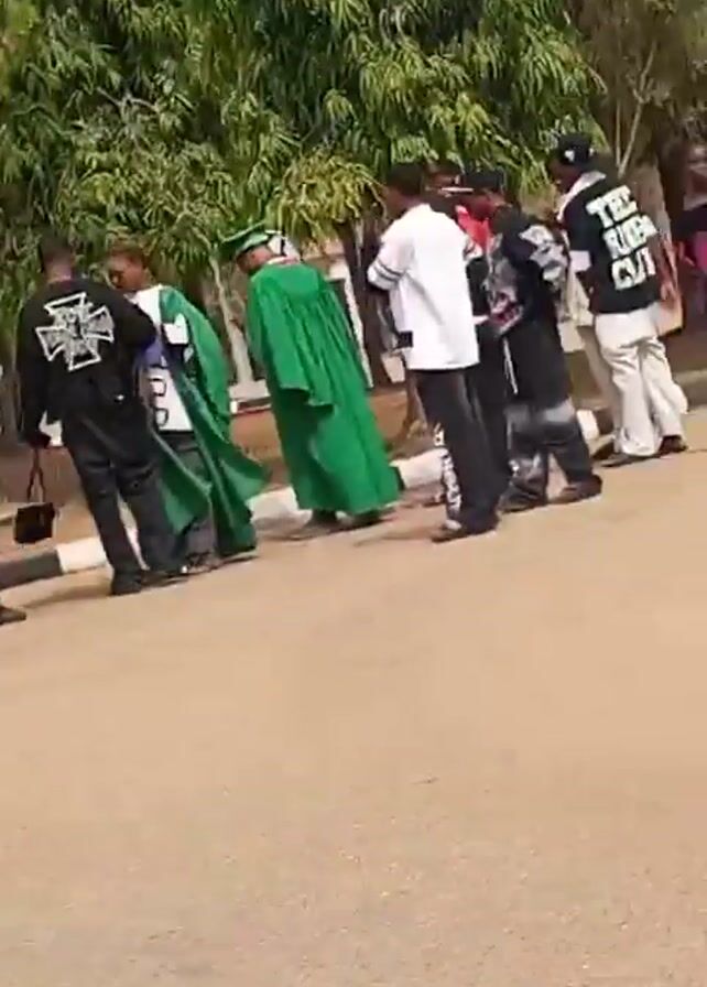 group of people in an outdoor setting, possibly a graduation ceremony. Several individuals are wearing green academic gowns and mortarboards. Others are dressed in casual clothing, including a person with a black jacket featuring a white cross on the back. Some people appear to be talking to each other. The setting seems to be a campus or park-like area with trees and paved ground. The camera moves slightly, shifting the focus between different members of the group.