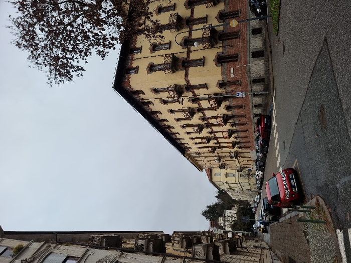 An urban street view depicts a tall, narrow building with numerous windows and ornate balconies dominating the scene. A tree with bare branches frames the building's top corner. A street lined with parked cars runs alongside the building, leading into the distance where more buildings are visible. A red car is parked prominently in the foreground. The sky is overcast.