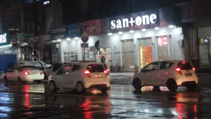 A nighttime street scene features a "san+one" store with illuminated signage. Two workers stand on scaffolding, appearing to be performing maintenance. Three white cars are visible on a wet road, reflecting red taillights. A "САРЕБЛИН ПАТИР" sign is seen on a building to the left. A no parking sign is present. The overall scene depicts urban activity in wet conditions.
