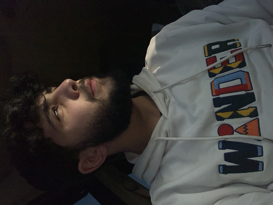 A close-up, dimly lit portrait features a male individual looking upwards and towards the right of the frame. The male has a medium skin tone, dark curly hair, and a dark beard and mustache. He is wearing a white hooded sweatshirt with white drawstrings that have silver tips. The front of the sweatshirt displays a colorful embroidered text design spelling "WONDER", where each letter is stylized with different colors and patterns; for example, the 'O' is a red circle and part of the 'N' is an orange triangle. Illumination originates from the left, highlighting the left side of his face. The background is dark and indistinct, providing no discernible environmental details or specific location within Dummar Municipality, Syria. No interactions are visible.