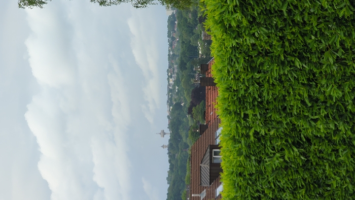 dense, green hedge in the foreground, obscuring the view of a residential neighborhood in Wuppertal, Germany