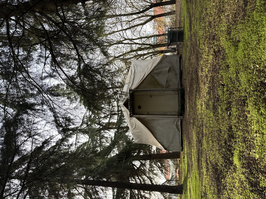 A tent stands near trees and green grass. The tent is partially open, revealing a door. Trees surround the tent, with bare branches visible above. Some trees are conifers with dark green needles. Grass covers the ground around the tent. A metal rack is nearby. The photo is slightly tilted, with the tent appearing vertical.