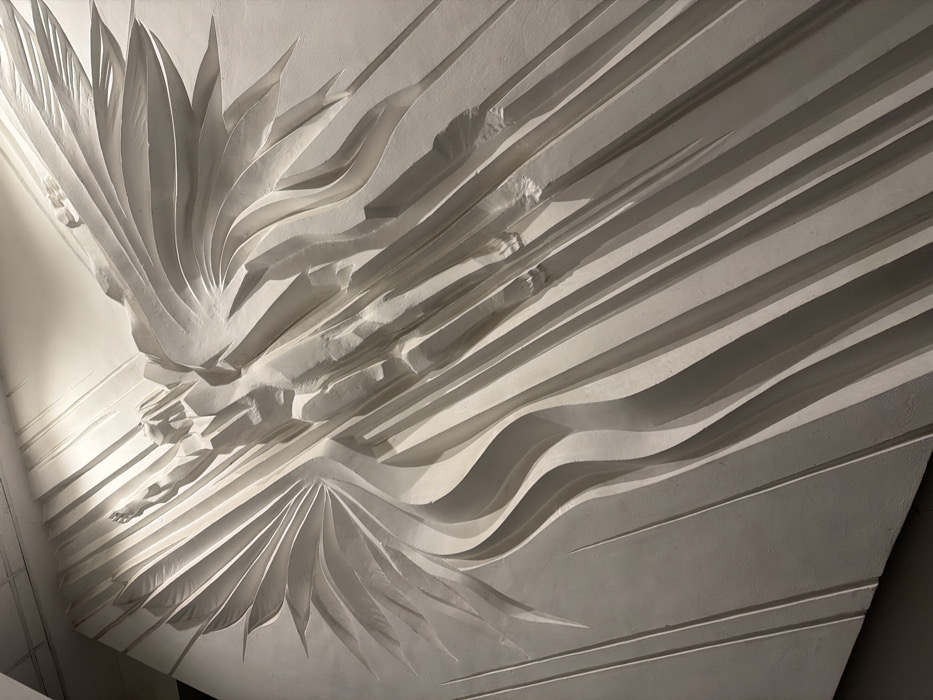 The image displays a large-scale, monochromatic white relief sculpture affixed to an interior wall