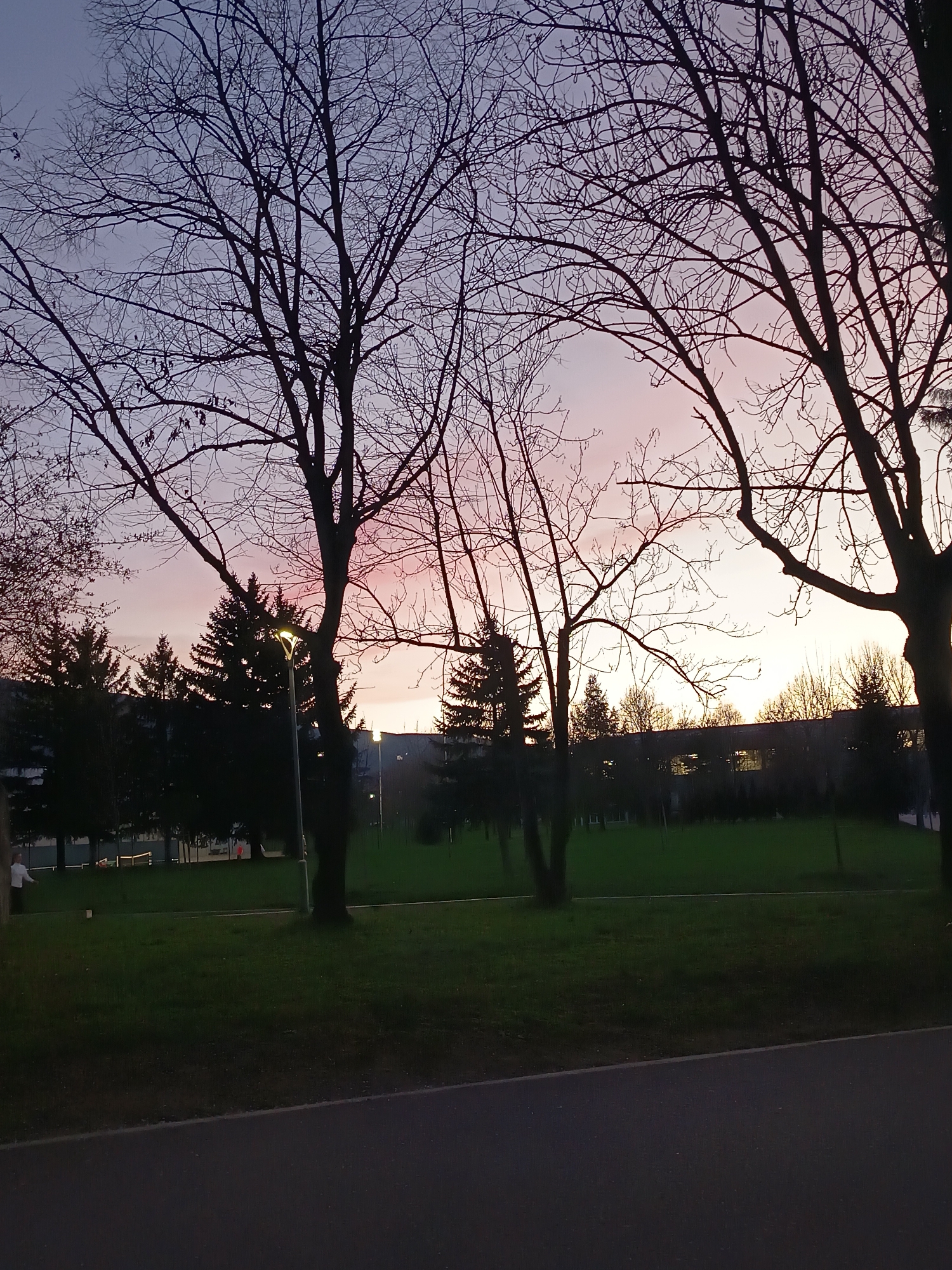 The image depicts a park setting in Sofia, Bulgaria at dusk. The sky transitions from purple to pink to orange near the horizon. Several bare trees dominate the foreground, their branches silhouetted against the colorful sky. In the midground, there's a grassy field, a row of evergreen trees, and streetlights. A building is visible behind the trees. A person is walking in the field. A paved walkway is in the lower portion of the frame.