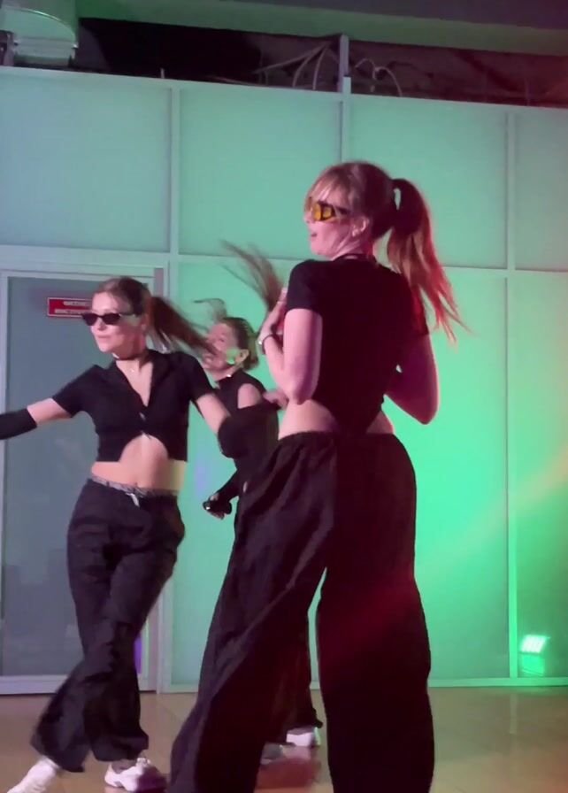 In a dance studio bathed in green and purple light, three young women perform a dance routine. The woman in the foreground, who wears black sunglasses, a black choker necklace, a black short-sleeved top with a sequined front, and loose black pants, is the focal point. She has her brown hair pulled back in a ponytail, and white sneakers on her feet. She moves with energy and expression, sometimes sticking her tongue out, engaging with the music and the audience, who are presumably off-screen. The other two women in the background are dressed in similar black attire. A door marked with a red sign in Russian is visible behind the dancers. The studio appears to be designed with a grid-like wall pattern, contributing to a modern, urban aesthetic.