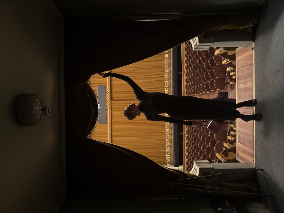 The image displays the interior of a classical theater auditorium in Tbilisi, Georgia, viewed from a dimly lit stage wing or entrance. A single individual stands silhouetted in a dark archway, facing the brightly lit, empty auditorium. The person wears a long-sleeved, high-necked, form-fitting dark dress and dark high-heeled shoes, with hair pulled back. Their left arm is raised, holding back a heavy, dark brown curtain to reveal the auditorium. The right arm holds a small, light purple handbag with metallic stud detailing. The person's head is tilted upwards and to the left, looking into the seating area. The immediate foreground features dark walls and a dark ceiling, from which an ornate, possibly crystal, chandelier and a modern smoke detector are suspended. To the left of the person, a dark photography tripod is partially visible behind another section of the dark curtain. The floor at the opening is a wooden threshold. The background shows rows of empty, reddish-brown upholstered theater seats, arranged in a tiered pattern. Behind the seats, the stage area or a back wall is covered with tall, vertically pleated curtains of a golden-yellow color. Above these curtains, a dark, rectangular vent or fixture is visible. The auditorium is brightly illuminated, creating a strong contrast with the dark foreground.