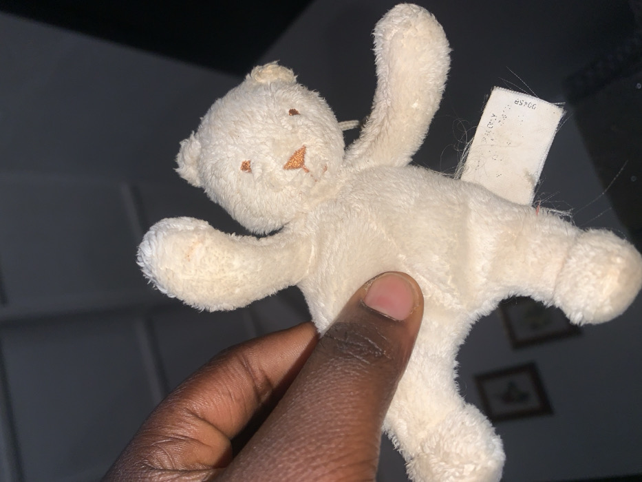 An indoor scene within a building in Sabon Tasha, Nigeria, is depicted under artificial, subdued lighting. A dark-skinned human hand, positioned on the left side of the frame, firmly holds a small, cream-colored plush teddy bear. The hand's thumb and index finger grip the bear's midsection; the thumb's nail shows a pinkish hue. The teddy bear features embroidered brown eyes, an orange triangular nose, and an orange stitched mouth. Its limbs are splayed outwards. A white fabric tag is attached to the bear's lower right side (viewer's right), with partially legible text including "ONLY" and "0045P". Slight discoloration, possibly staining, is present on the bear's left ear. In the background, two framed pictures with light-colored borders are visible on a wall, their contents indistinct. The overall background is dark and out of focus.