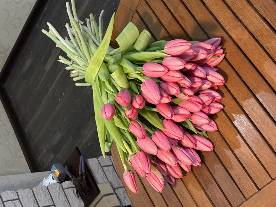The scene is set indoors in Slavyansk-na-Kubani, Russia. A large bouquet of approximately 70-80 fresh, bright pink tulips with green stems and leaves lies horizontally on a slatted wooden table with a reddish-brown finish. The tulips are bundled with their stems pointing to the upper right of the frame, and their closed or partially open flower heads are distributed across the lower and central areas of the table. In the background to the left, a decorative structure constructed from light gray brick-patterned tiles is partially visible. On a dark brown ledge of this structure, a pair of gardening shears with purple handles rests next to a small blue plastic container with a white lid. The floor beyond the table and decorative structure is dark plank flooring. A light-colored patterned wallpaper is visible on the wall in the upper background. No people are present in the image, and no specific action is depicted beyond the placement of the bouquet and objects.