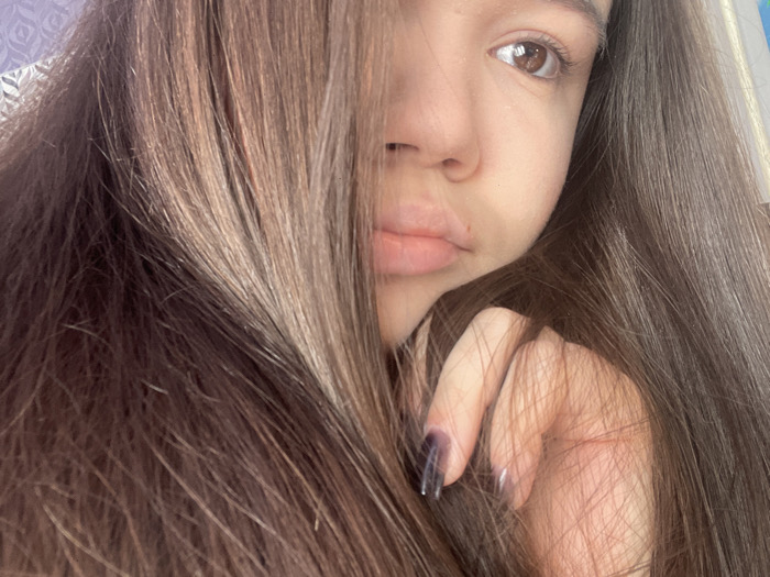 The image presents a close-up portrait of a female subject, situated indoors in the city of Chaikovsky, Russia. Long, light to medium brown hair dominates the left side of the frame, obscuring the subject's left facial features and extending across a significant portion of the foreground. The visible right side of the face includes a brown eye directed towards the viewer, the bridge of the nose, and slightly parted lips. A right hand, with fingers displaying dark-colored or gradient nail polish, is positioned below the chin, partially concealed by the hair. In the upper left background, a faint, light-colored patterned surface, consistent with wallpaper, is visible.