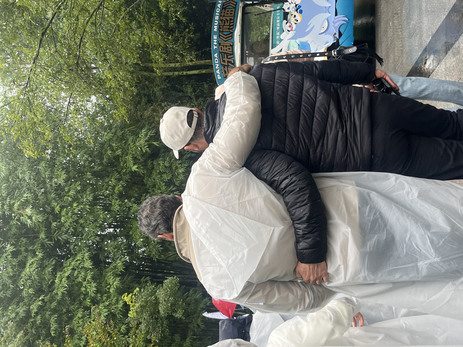 Two adult males are depicted from behind, centered in the foreground, during wet weather conditions at the Chengdu Research Base of Giant Panda Breeding in Chengdu, China