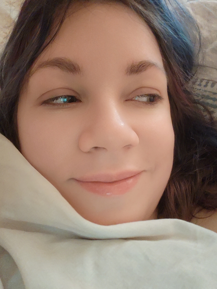 A female individual is depicted in a close-up portrait, positioned horizontally in what is identified as Свистуха (кузяевский С/о), Russia. Her dark brown hair, containing visible blue and purple streaks on the left side, frames her face. Both eyes are open, with her gaze directed towards the viewer's left. A distinct blue reflection, exhibiting a multi-pointed shape, is present in the pupil of her right eye (viewer's left). Her eyebrows are dark brown and well-defined. Her mouth is closed, with the corners subtly upturned in a slight smile. A small, white, raised mark is visible on the lower lip. The lower portion of her face and neck are partially covered by a light, pastel green fabric. A patterned fabric is visible in the background to the left of her head.