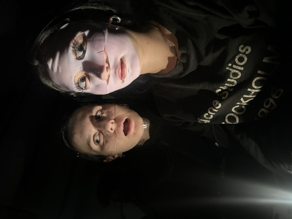 This image, captured in Incheon, South Korea, depicts two individuals in a dimly lit environment, illuminated by a strong upward light source. The individual in the foreground, on the right, wears a light pink facial sheet mask, a dark long-sleeved shirt bearing the text "Acne Studios STOCKHOLM 1996" in light-colored font, a thin silver necklace, and silver hoop earrings. Her eyes are wide open, directed towards the camera. The second individual, positioned behind on the left, wears a translucent facial sheet mask, a dark zipped jacket, and small silver earrings. Her mouth is agape in an "O" shape, with a liquid drip visible from her chin, and her wide eyes gaze upwards and to her right. The background is uniformly dark, providing no additional environmental context.