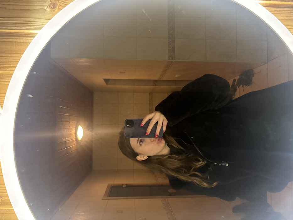 A young woman is seen in a mirror selfie. She is holding a black smartphone with red nails visible. Her hair is light brown and slightly wavy, falling over her left shoulder. She is wearing a black coat. The bathroom behind her features light-colored, square tiles on the wall and a wooden paneling above the vanity. A light fixture with a warm glow is visible in the mirror. The mirror itself is circular with a white frame.