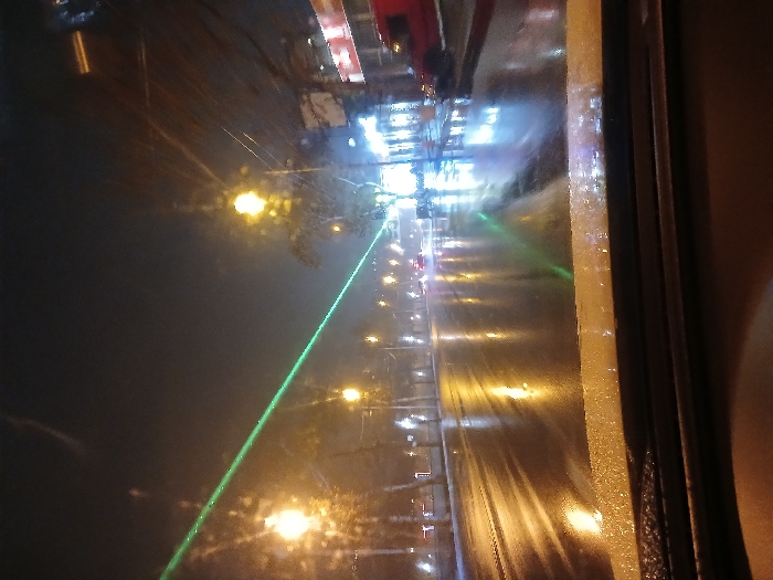 A rainy night street scene viewed through a wet window. Streetlights illuminate the slick road, creating elongated reflections. A green laser beam slices diagonally across the scene. The image is framed by the window pane on the right, showcasing water droplets. Faintly visible are buildings and street infrastructure in the background, distorted by the water and window.